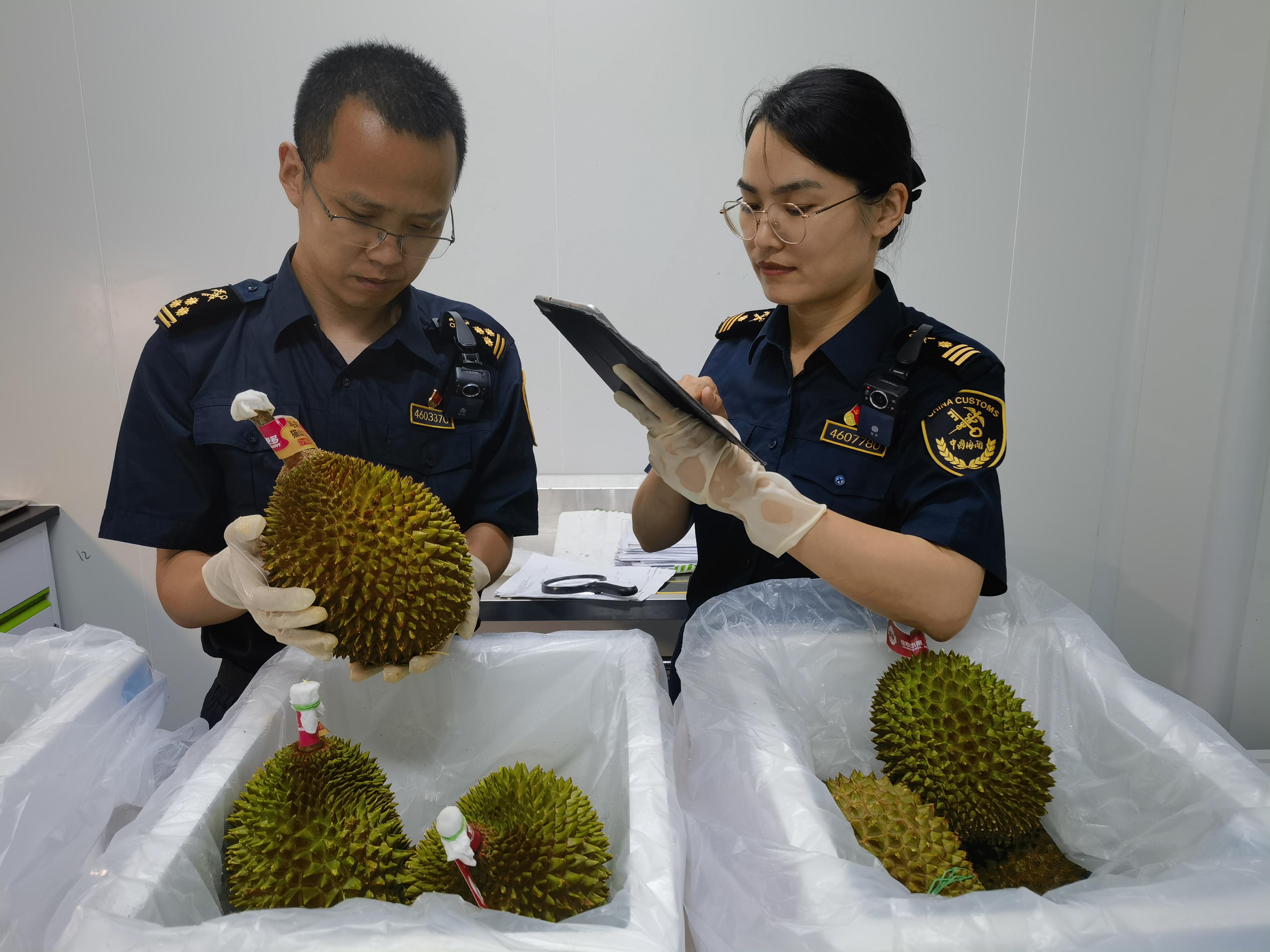 2024年8月24日,郑州机场海关工作人员正在查验首批进入中国市场的马来西亚鲜食榴莲。新华社发(郑州海关供图)
