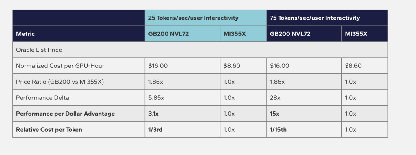 对于超大规模云计算厂商(Hyperscalers)而言,总体拥有成本(TCO)是核心考量指标。Signal65 结合 Oracle 云定价数据分析指出,GB200 NVL72 机架不仅性能强悍,经济性同样惊人。其每 token 的相对成本仅为 AMD 方案的十五分之一,同时还提供了更高的交互速率。