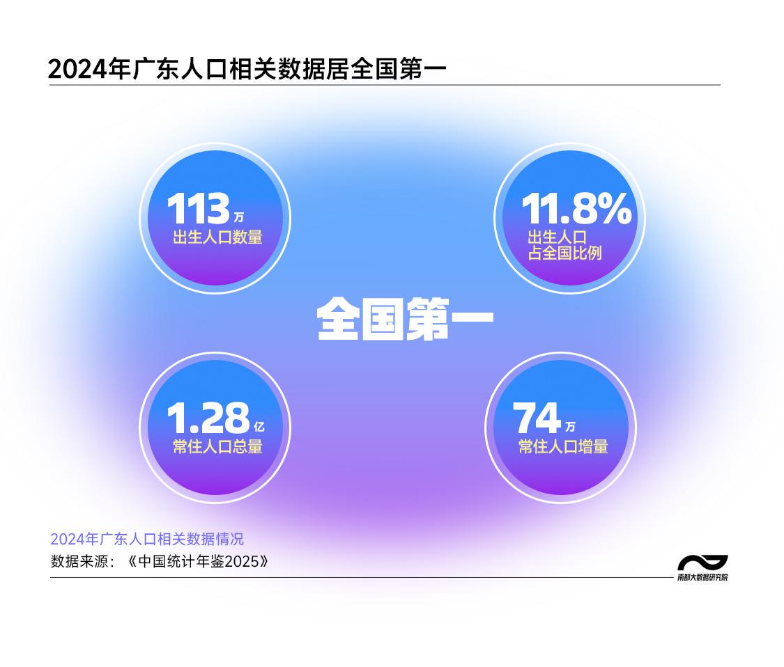 2024年,广东在人口领域拿下四个“全国第一”:出生人口113万、出生人口占全国比例11.8%、常住人口总量1.28亿、常住人口增量74万。这组数据,清晰勾勒出广东在人口发展上的综合优势。
