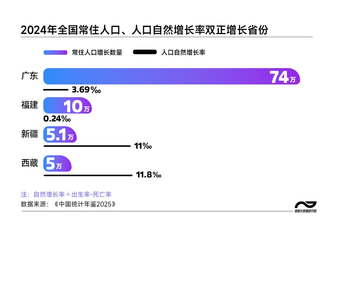 2024年广东、福建、新疆、西藏实现常住人口与人口自然增长率“双正增长”。